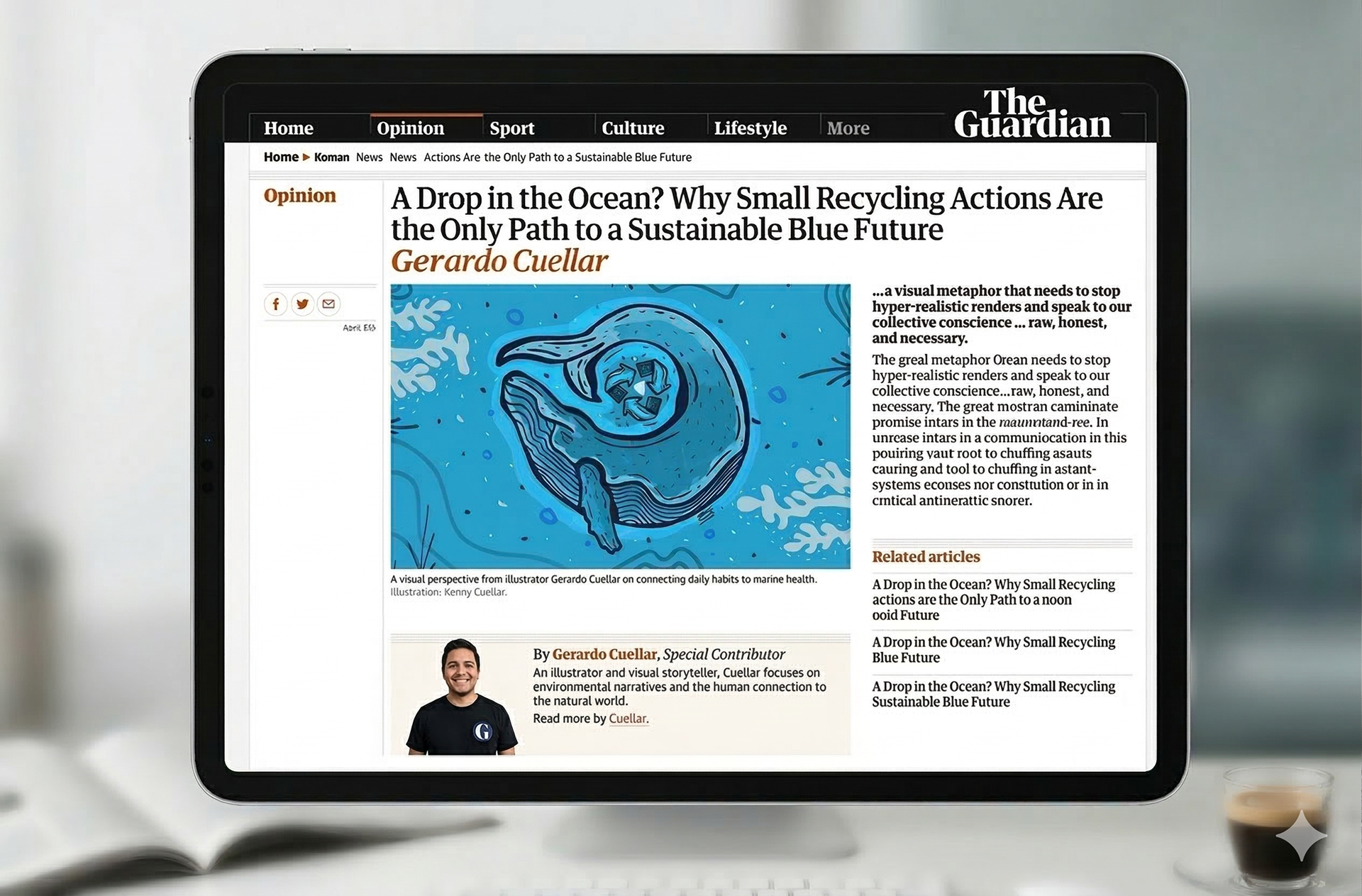 This illustration was conceptualized for The Guardian’s Opinion section to accompany an editorial titled "A Drop in the Ocean? Why Small Recycling Actions Are the Only Path to a Sustainable Blue Future." The artwork employs a circular, organic composition where the majestic form of a whale merges with the universal symbol for recycling, suggesting that the health of marine life is inextricably linked to our daily consumption habits. By utilizing a hand-drawn, textured style over a vibrant blue palette, the piece aims to humanize environmental narratives—moving away from sterile, hyper-realistic renders toward a more "raw and honest" visual metaphor that speaks directly to our collective conscience.